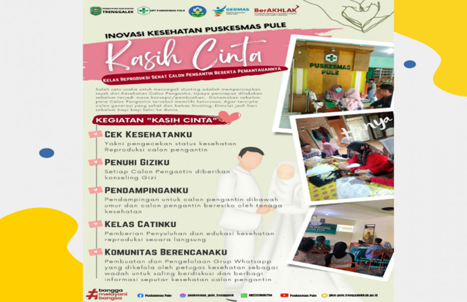 Dengan adanya kondisi tersebut dicetuskanlah inovasi “KASIH CINTA” untuk mengoptimalisisi pencegahan stunting. Akronim dari “Kelas Reproduksi Sehat Calon Pengantin Beserta Pemantauannya”. Dengan sasaran para calon pengantin yang ada di wilayah Kecamatan Pule.